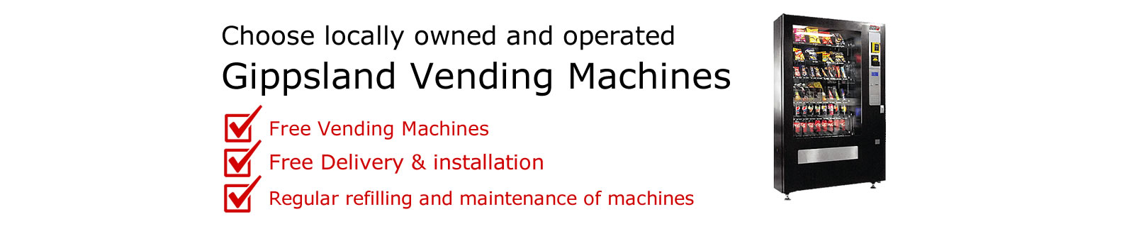Covering Bairnsdale, Paynesville, Lakes Entrance, Orbost, Sale, Maffra and surrounding districts, locally owned and operated Gippsland Vending Machines offer a large range of drinks, including: water, fruit juices, soft drinks, diet soft drinks together with snacks, including: chocolate, chips, cookies, general lollies, gum.